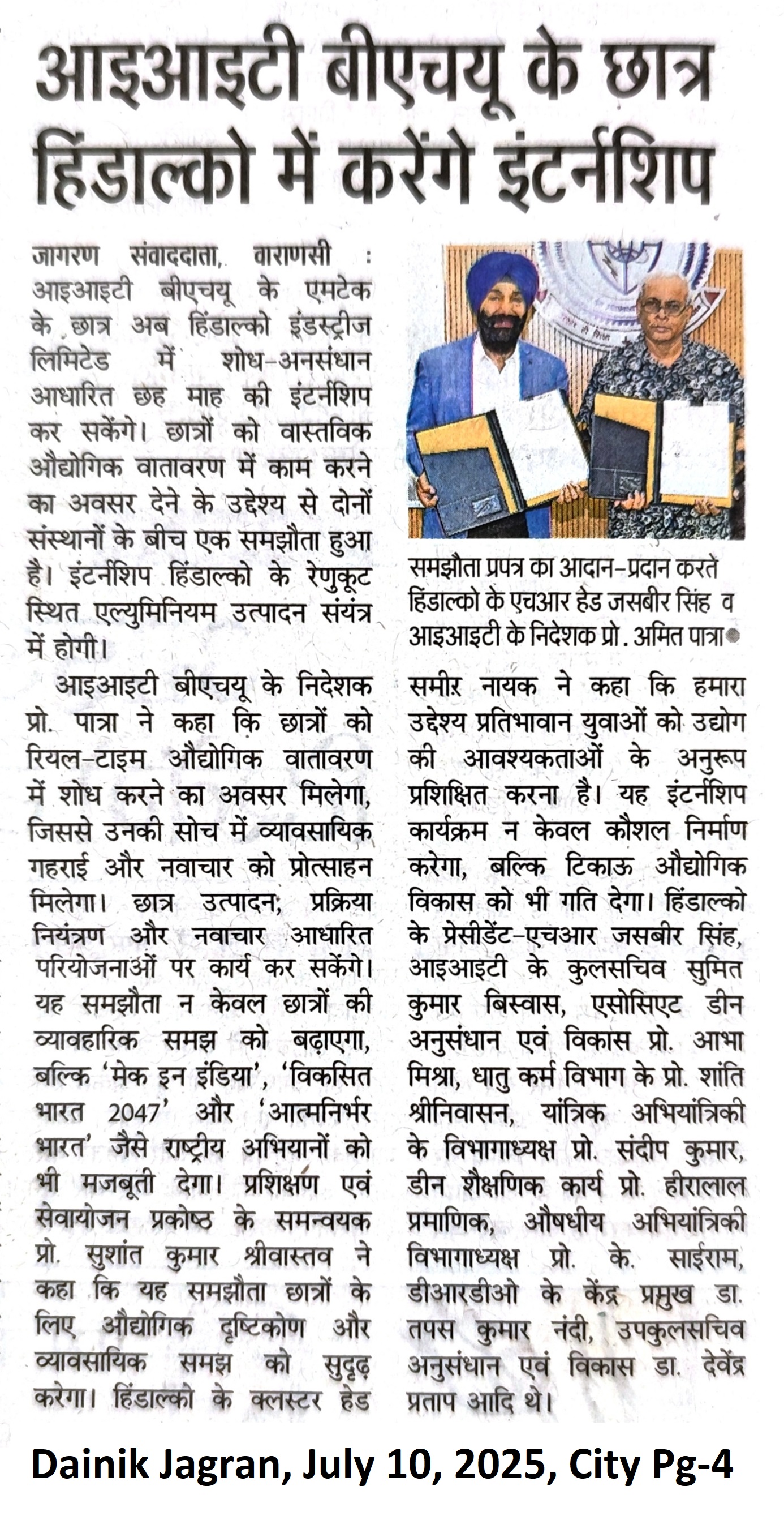 आईआईटी बीएचयू के छात्र हिंडालको में करेंगे इंटर्नशिप