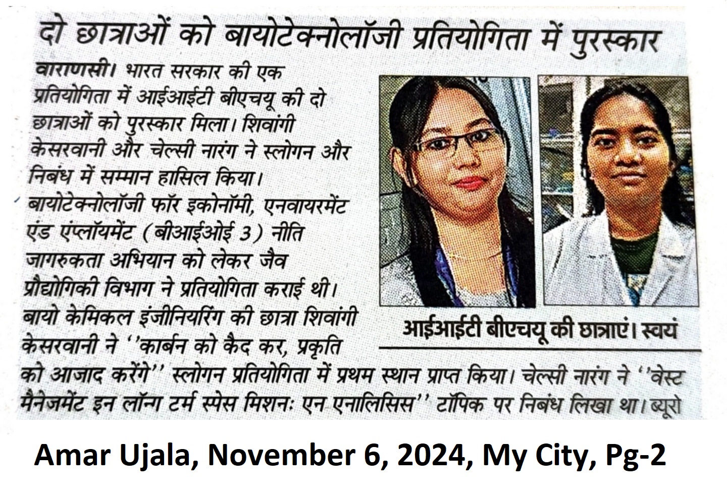 दो छात्राओं को बायोटेक्नोलॉजी प्रतियोगिता में पुरस्कार