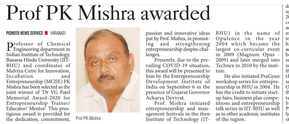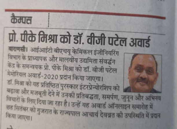 आईआईटी बीएचयू केमिकल इंजीनियरिंग विभाग के प्राध्यापक और मालवीय उद्यमिता संवर्द्धन केंद्र के समन्वयक प्रो. पीके मिश्रा को डॉ. वीजी पटेल 'मेमोरियल अवार्ड-2020 प्रदान किया जाएगा। डॉ.मिश्रा को यह प्रतिष्ठित पुरस्कार इंटरप्रेन्योरशिपका। बढ़ावा और मजबूती देने में उनकी प्रतिबद्धता, समर्पण, जुनून और अभिनव विचारों के लिए दिया जा रहा है। उन्हें यह अवार्ड ऑनलाइन समारोह में छह सितंबर को गुजरात के राज्यपाल आचार्य देवव्रत की उपस्थिति म प्रदान किया जाएगा।
