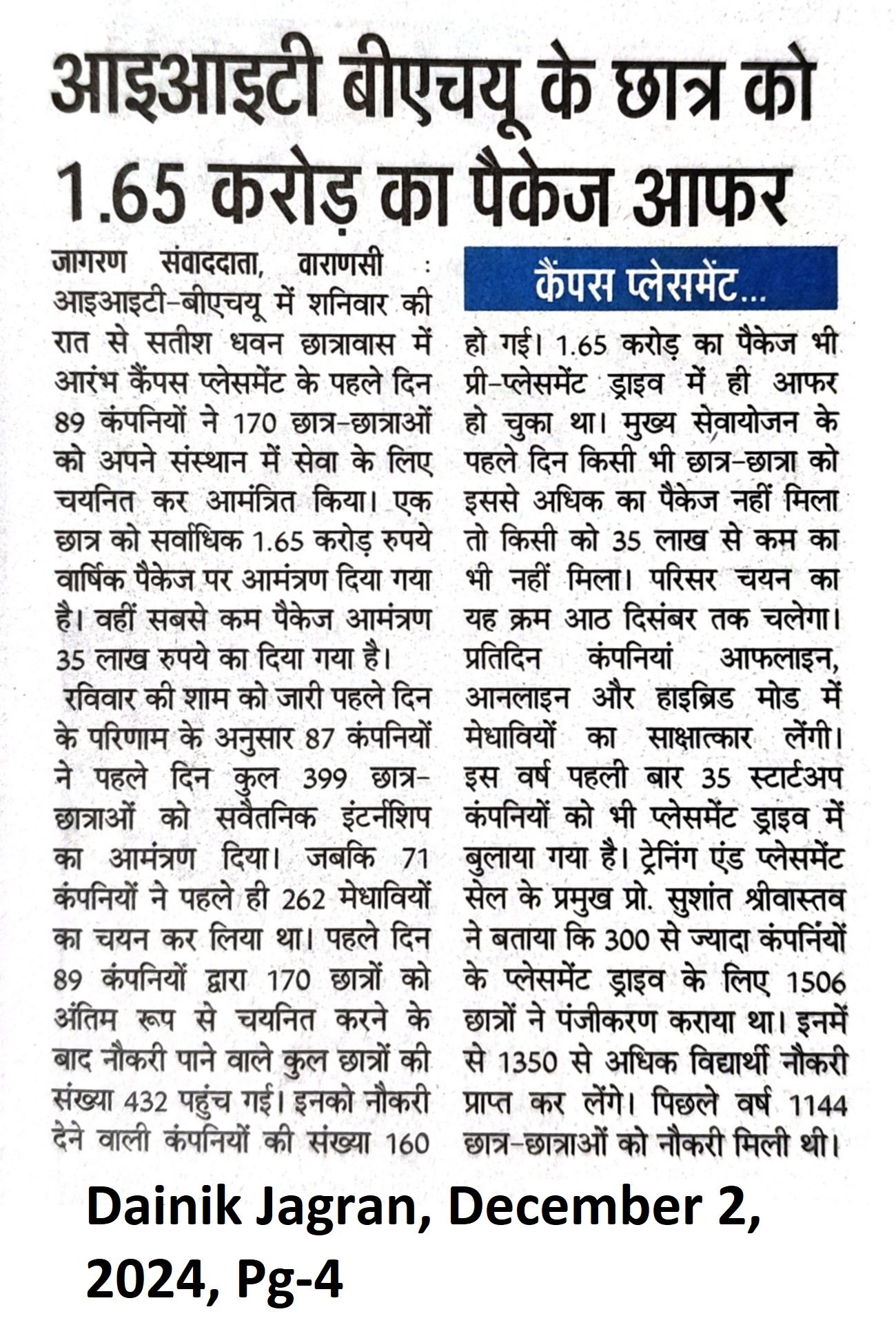 आईआईटी बीएचयू के छात्र को 1.65 करोड़ का पैकेज ऑफर