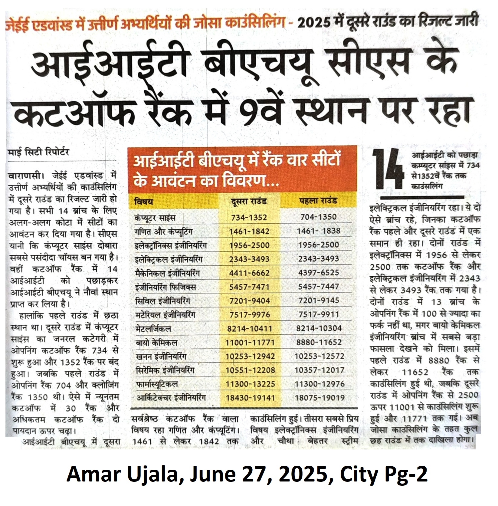 आईआईटी बीएचयू सीएस के कटऑफ रैंक में 9वें स्थान पर रहा