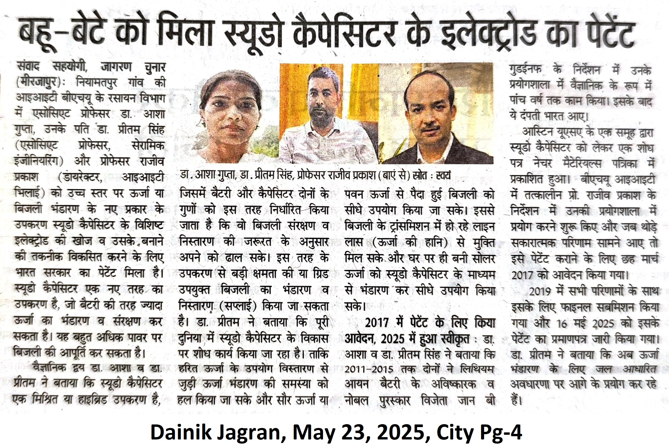 बहु बेटे को मिला स्यूडो कैपेसिटर के इलेक्ट्रोड का पेटेंट