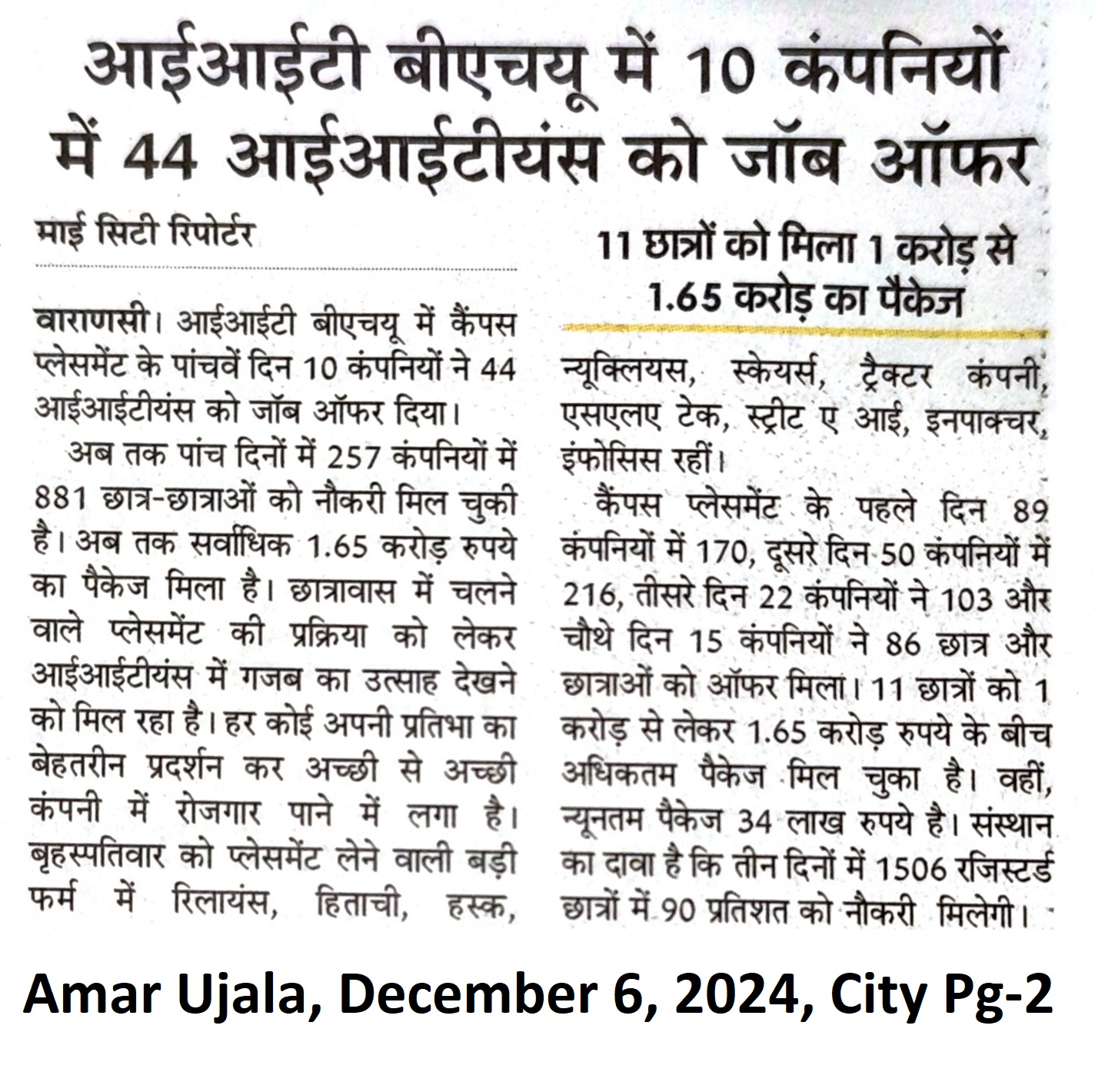 आईआईटी बीएचयू में 10 कंपनियों में 44 आईआईटियन्स को जॉब ऑफर