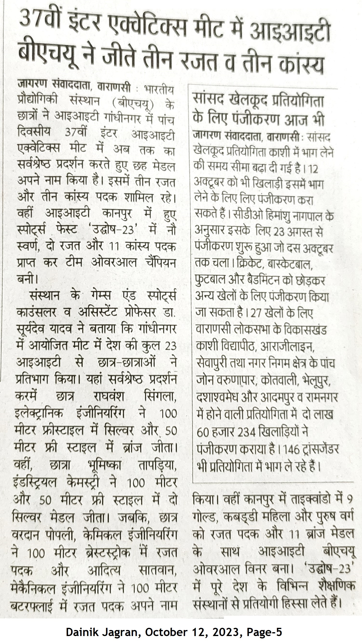 ३७वी इंटर एक्वाटिक्स मीट में आईआईटी बीएचयू ने तीन रजत और ३ कांस्य पदक जीते