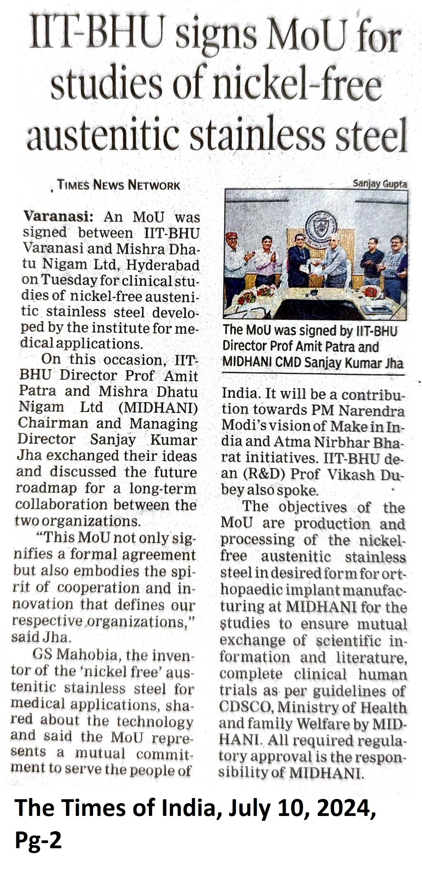 IIT-BHU signs MoU for studies of nickle-free austenitic stainless steel